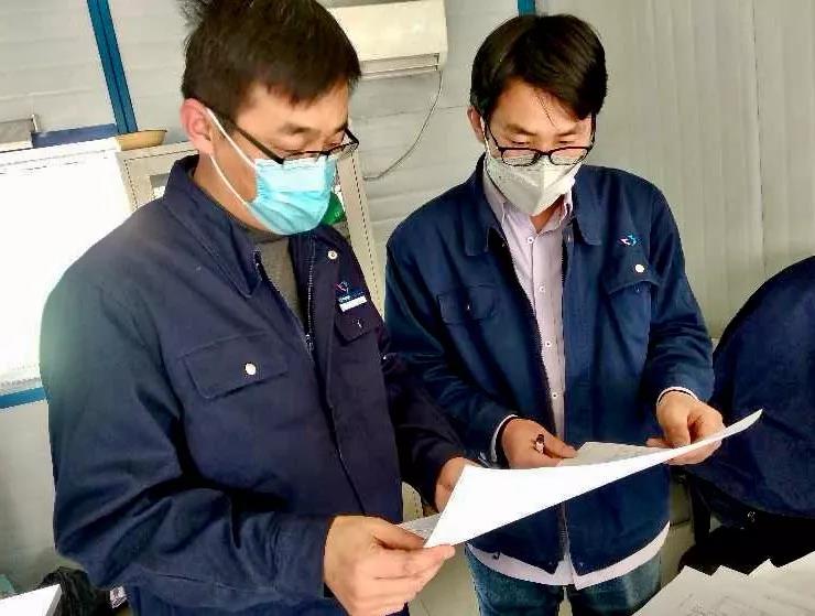 ▲石家庄首页副总经理赵勇征(左一)与同事在项目工地研究推进研发和中试项目收尾工作。