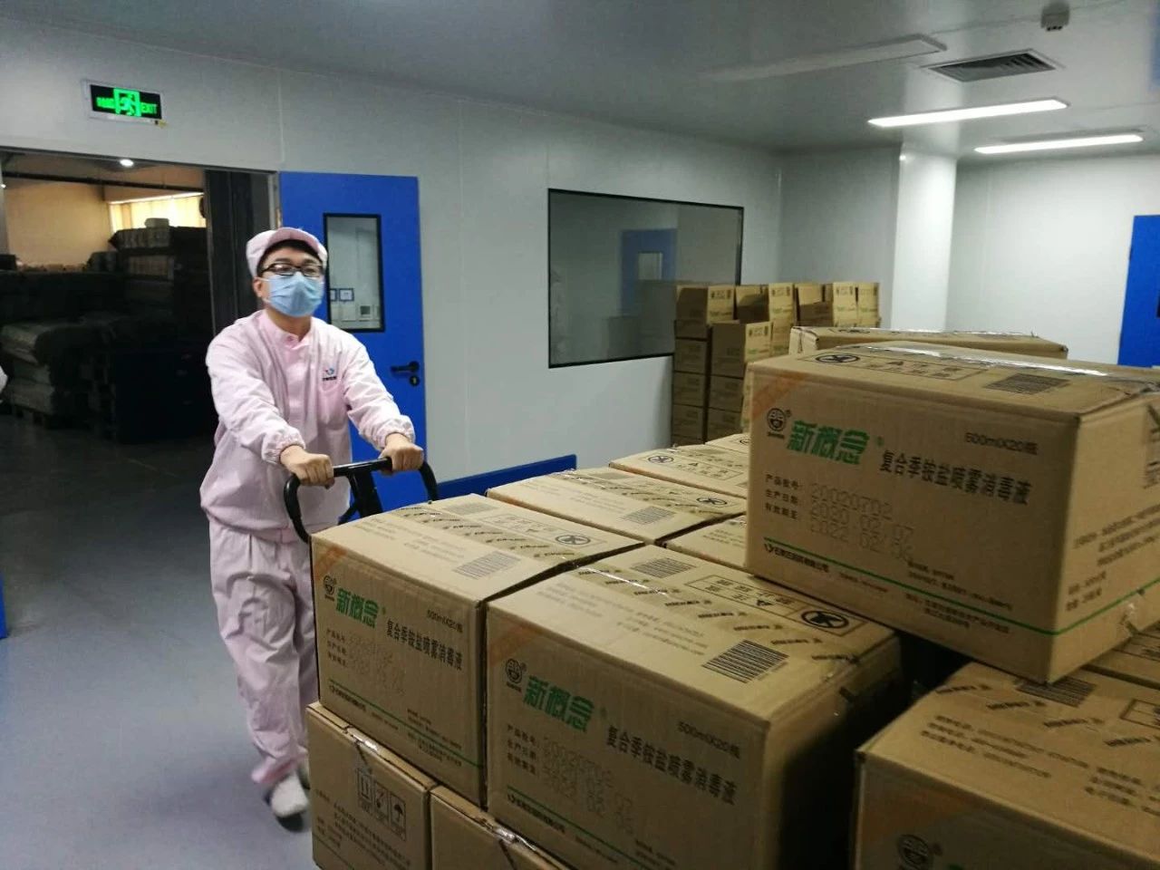 ▲石家庄首页为适应市场需求赶制生产的新概念消毒剂正抓紧入库。