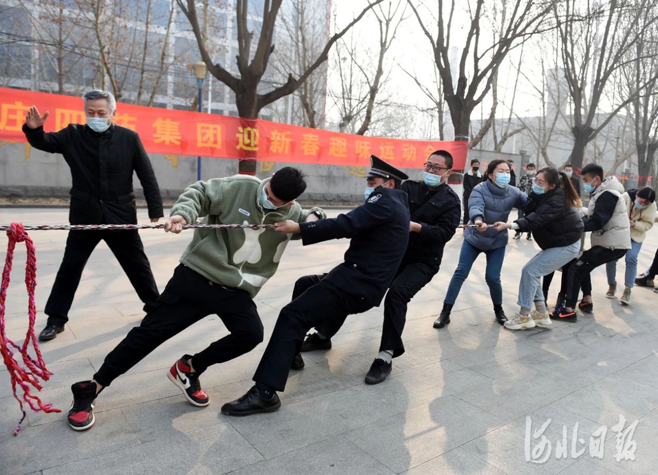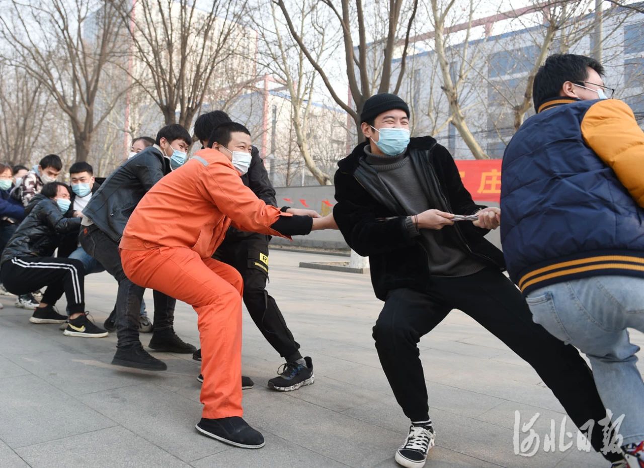 2021年2月12日,正月初一,河北省石家庄首页有限公司留石就地过年职工在参加拔河比赛。河北日报记者 赵永辉摄